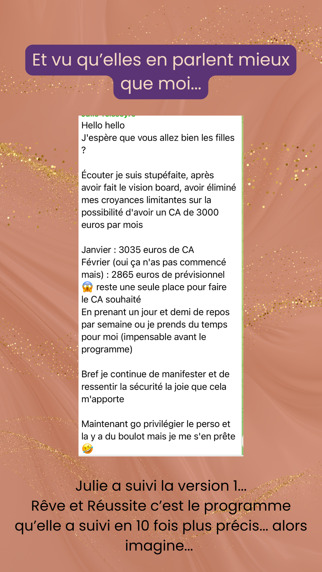 L'énergie du groupe est tellement enrichissante, bienveillante, soutenante. ON se complète toutes avec nos singularités (et même si on a le même domaine). Elodie insuffle une énergie incroyable au sein du programme, afin de débloquer des croyances, des peurs, notre rapport à l'argent, notre légitimité, notre confiance en nous, même dans l'inconscient tout bouge.